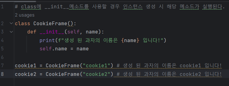 class를 사용해서 만들어진 과자 = 인스턴스(instance) = 객체(object)