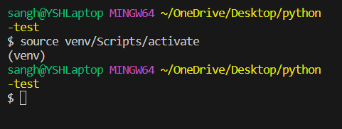 venv이름으로 가상환경을 만들었다면, 아래와 같이 source venv/Scripts/activate 터미널에 입력.