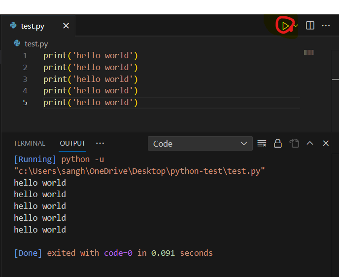 혹은 오른쪽 위에 있는 재생버튼 눌러서 실행. - 파이썬 터미널 생성