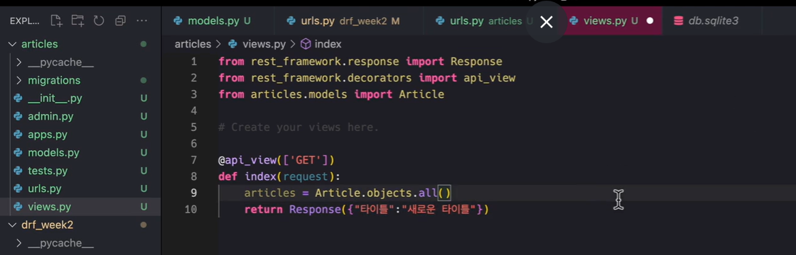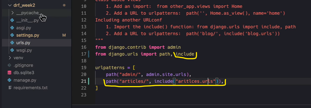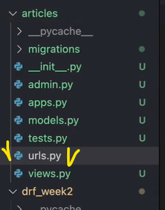 3. drf_week2 ➔ urls.py 에 있는 코드를 articles ➔ urls.py에 복붙하기