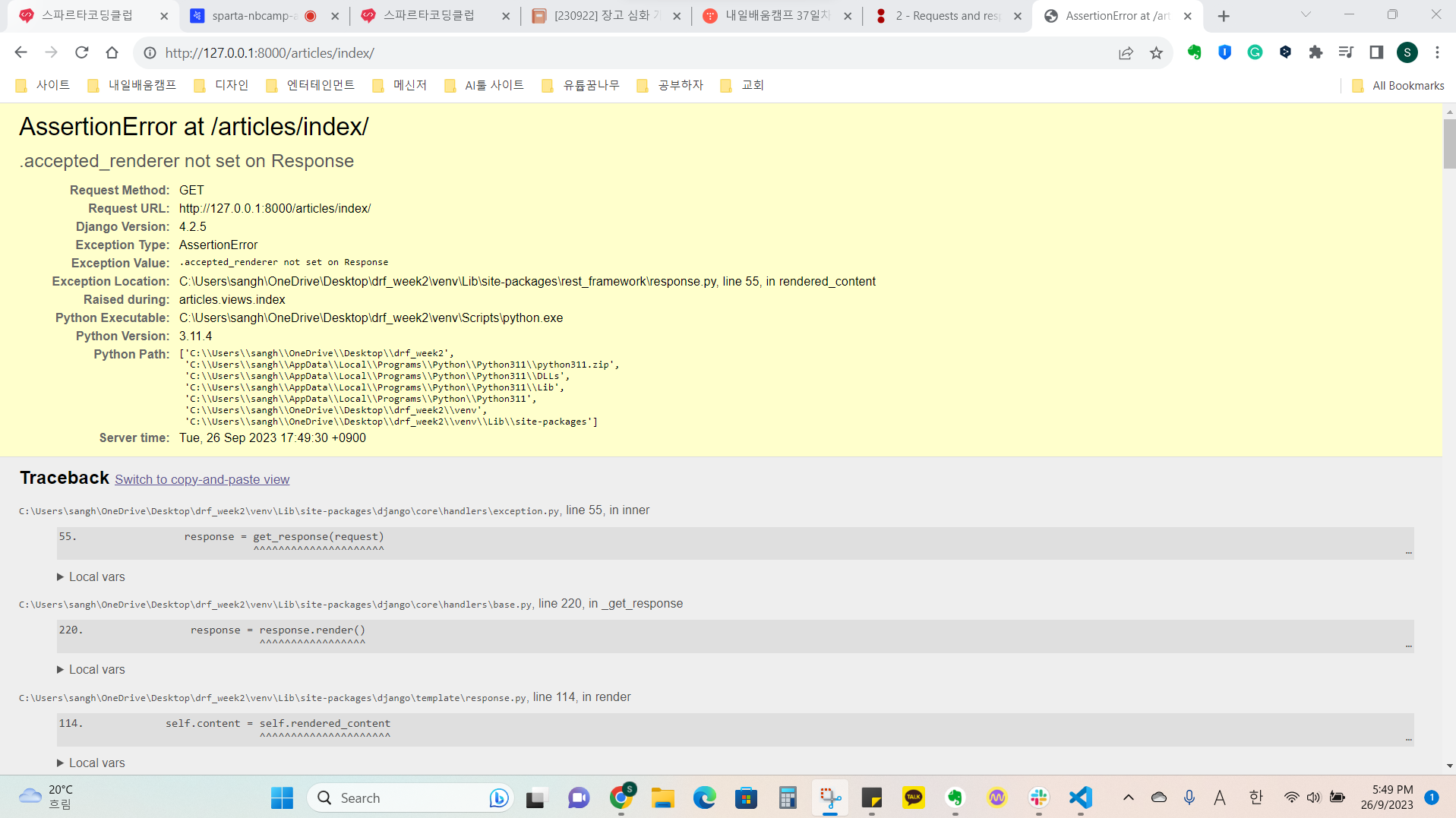 5. articles ➔ views.py 에도 index가 없기 때문에 error가 뜰 것임으로 views.py로 가서 index 만들어주자