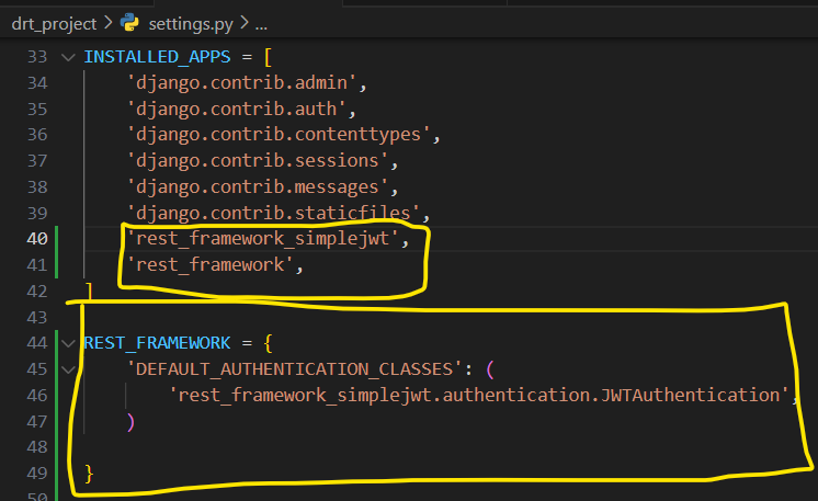#setting.py>installed app> rest framework, simple jwt 추가 ➜ 이 2개 추가사항은 아래 스크린샷확인