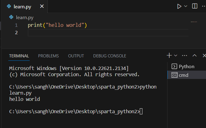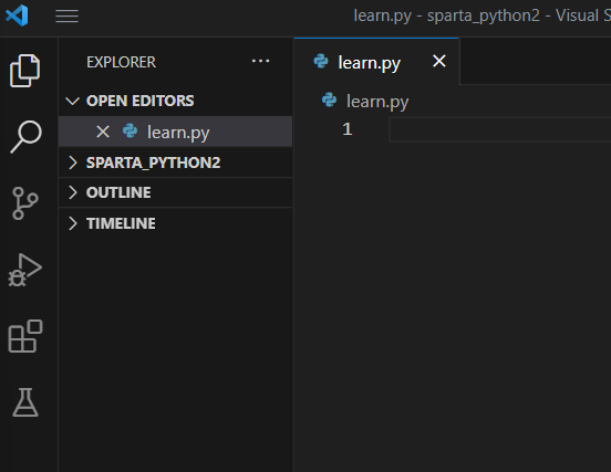 바탕화면에 새파일 이름을 SPARTA_PYTHON2으로 만들고, NEW FILE을 생성_learn.py