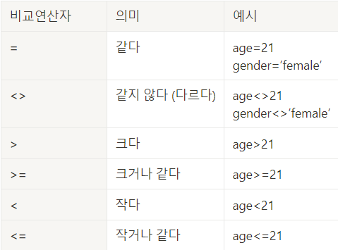 우리가 기본적으로 사용하는 연산표현을 SQL에서는 아래 비교연산자를 활용해서 사용한다.