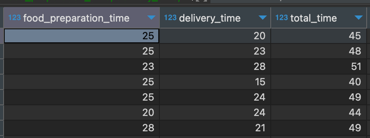 food_preparation_time + delivery_time as total_time