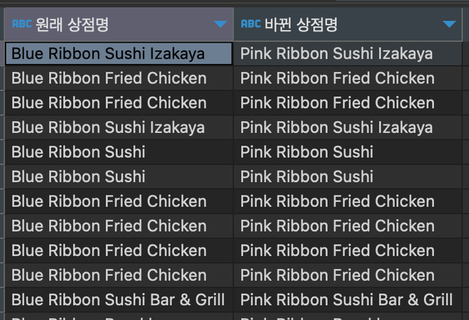replace(restaurant_name, 'Blue', 'Pink') "바뀐 상점명"