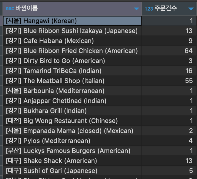 [실습] ‘[지역(시도)] 음식점이름 (음식종류)’ 컬럼을 만들고, 총 주문건수 구하기