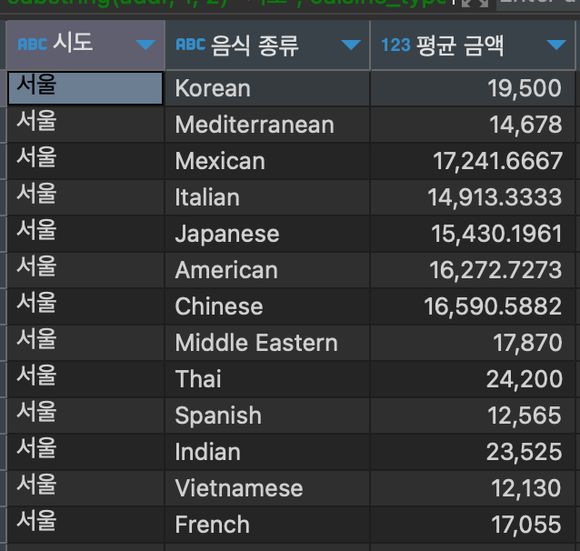 [실습] 서울 지역의 음식 타입별 평균 음식 주문금액 구하기 (출력 : ‘서울’, ‘타입’, ‘평균 금액’)