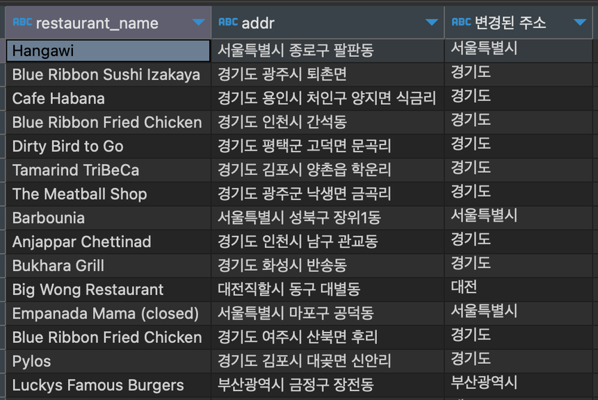 실습1. 주소의 시도를 ‘경기도’ 일때는 ‘경기도’, ‘특별시’ 혹은 ‘광역시’ 일 때는 붙여서, 아닐 때는 앞의 두 글자만 사용