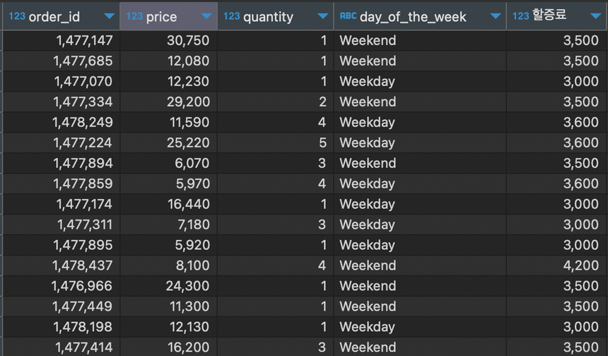 if(day_of_the_week='Weekday', 3000, 3500)*(if(quantity<=3, 1, 1.2)) "할증료"