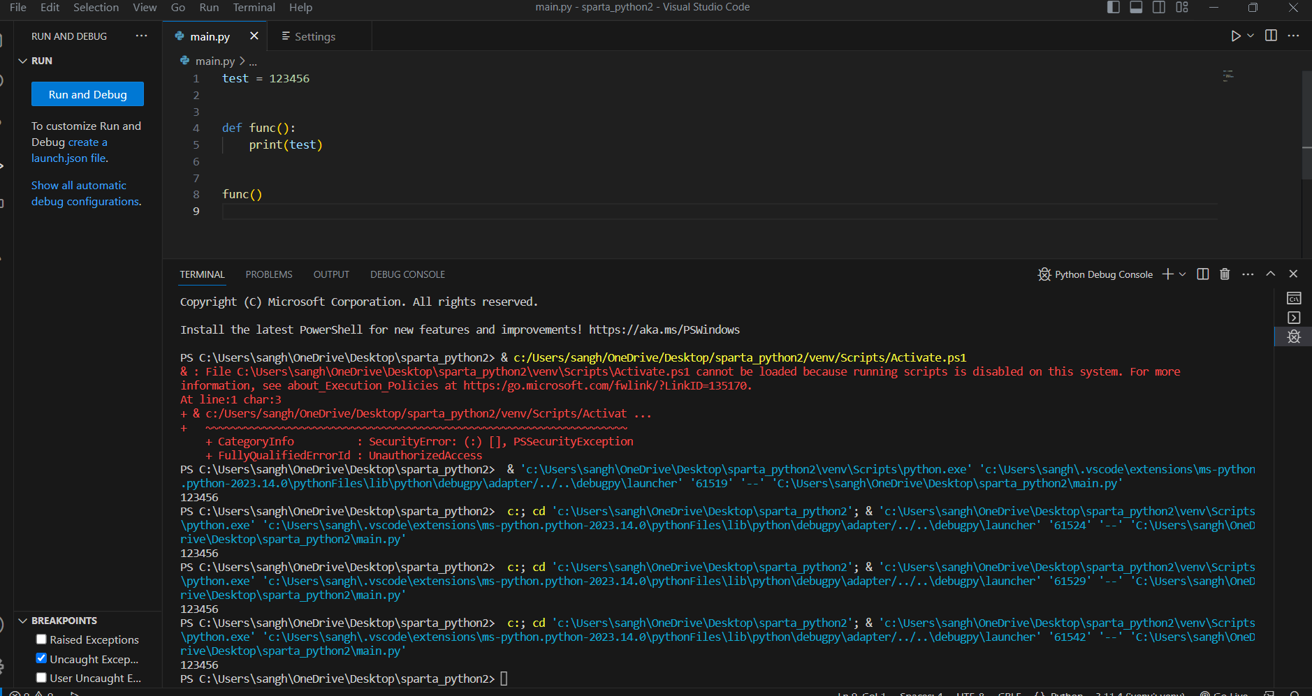 cmd 터미널로 디폴트 터미널을 변경 (crtl + shift + p 누르고 검색하기) 하거나 파워쉘 권한을 낮추면된다.